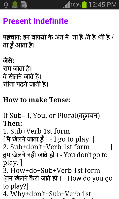 किसी भी sentences को hindi से english में translate करने के लिए tense grammar rules का प्रयोग होता है जो बहुत ही आसन होता है , मैं यहाँ पर आपको जितने भी tense rules के. Present indefinite tense ki pehchan hindi mein. Present imperfect tense (s+is/am/are+v4+o) : Formula present tense and its types, simple present tense in english, simple present tense in hindi. Subject + verb1 में s/ es + object.